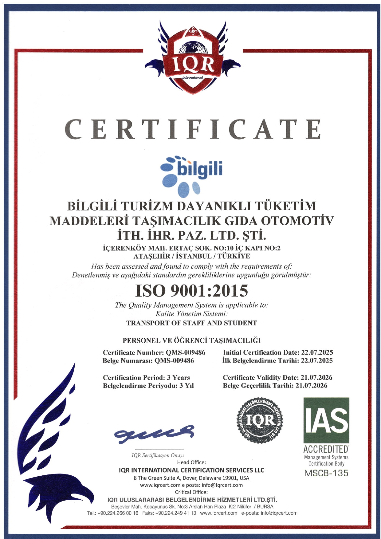 Bilgili Turizm olarak, müşteri memnuniyetini her zaman en üst seviyede tutmayı hedefliyor; güvenli, dakik ve konforlu bir taşımacılık deneyimi sunmak için çalışıyoruz.